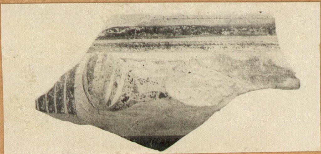 | Description: | Rim fragment; handle with horns. Decorated with horizontal lines and vertical lines beside the handle. Paint peeled outside. Subgeometric style. | |