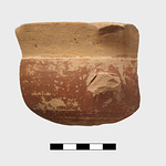 Description:   Rim and upper wall fragment preserving attachments of vertical band handle. High rim, inset and tilted slightly outward. Covered over all with thick dull red glaze; a reserved band inside the lip, and the handle banded. Glaze completely gone from rim outside.