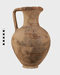 | Description: | Restored in plaster. Flaring ring foot and plump ovoid body; slightly concave neck and trefoil mouth. Body reserved except for outer face of foot, double band half way on shoulder, and wide band bordered by narrow ones below shoulder. On shoulder, two sets of compass drawn concentric half circles at the front; wavy verticals between them and to the side. Pendent tails beside handle attachment at the back. The neck reserved, except for glaze band at its base; inner and outer faces of lip glazed. On handle, St. Andrew's cross. Soft pinkish-buff clay; dull glaze, black to reddish-brown, much worn and peeled. | |
