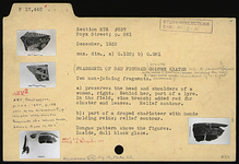 | Description: | Two non-joining fragments. a) Preserves the head and shoulders of a woman, right. Behind her, part of a lyre. In the field, vine branch; added red for cluster and leaves. Relief contour. b) Part of a draped charioteer with hands holding reins; relief contour. Tongue pattern above the figures. Inside, dull black glaze. ADDENDA Some more fragments added from tins (no. 9) in Dec. 1955: c) Rim and neck fragment. On vertical part of rim, dotted egg. On upper part of neck band of slanting palmettes. Mended from 5 pieces. d) Rim fragment preserving the beginning of the egg and palmette zones. e) Mended from three pieces. Half of one handle. Tongue pattern at the attachments. Ivy pattern along the sides. | |