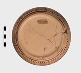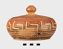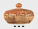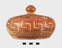 Description:   Pyxis: mended from many pieces, chips and small fragments missing. Hatched maeander between bands on body; lower down, a row of dots. Lid: two small fragments and top of knob missing. Decorated with a row of staggered dots between bands. Zigzag on round knob.