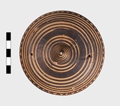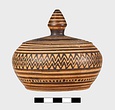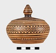 | Description: | Pyxis intact. Triple zigzag around body, between bands; lower on body, a row of dots. Lid intact, banded, with conical banded knob. | |
