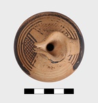 | Description: | Intact save chip from end of spout. Trefoil mouth; tall narrow neck; squat body; low flat base. Shoulder decorated with three large crisscrossed triangles and a single line of vertical maeander beside the handle on one side. Bands around neck and below shoulder; the lower part of the body black. Worn black glaze. | |