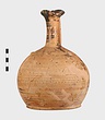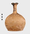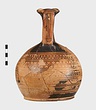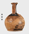 | Description: | Mended from many pieces. A few small fragments of the body missing. Trefoil mouth; tall very narrow neck; rounded body; low ring foot. Two small protuberances on the shoulder. Decoration, all between groups of bands: on the neck, quadruple zigzag, then staggered strokes. On the handle, two vertical bands of diagonals. On the shoulder, hatched maeander; below, alternating strokes, then triple zigzag, then again alternating strokes. Below, to the base, wide black bands alternating with pairs of narrow bands. Black glaze, much worn. | |