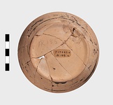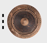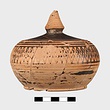 | Description: | Pyxis, mended from many pieces, chips missing. Triple zigzag band around body; narrow bands above and below. Lid, mended from two pieces, chips missing. Black save for bands at edge. Banded conical knob. Black to brown glaze, worn on body and knob. | |