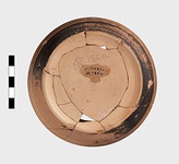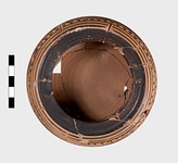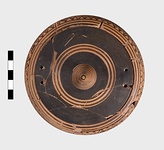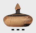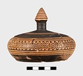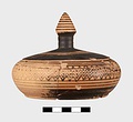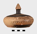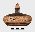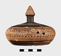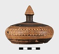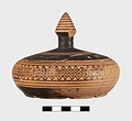 | Description: | Pyxis mended from many pieces; chips and a few small fragments missing. Quadruple zigzag between bands around body. Lid mended from several pieces; chips missing. Black save for three reserved stripes near center. Knob, black below, then conical, banded, above. | |