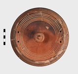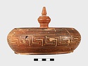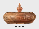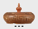 | Description: | Pyxis mended from many fragments; chips missing. Hatched maeander around body, with single zigzag above and below, all set off by bands. Lid mended from many fragments; chips missing. At outer edge, a row of dots between bands. Knob, ribbed below, then round, with band of chevrons; then tall conical, banded. | |