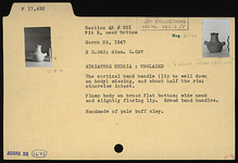 | Description: | The vertical band handle (lip to well down on body) missing, and about half the rim; otherwise intact. Plump body on broad flat bottom; wide neck and slightly flaring lip. Broad band handles. Handmade of pale buff clay. | |