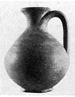 | Description: | Two small holes in body, otherwise intact. Plump round body on simulated ring foot; narrow neck; plain round mouth. Handle from below lip to well down on body. Handmade of dark brown micaceous clay; rather heavy fabric. Signs of paring on the outside. | |