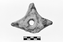 | Description: | A four-footed object - one of the feet broken off and missing - made by turning the ends of a four-pointed star-shaped piece of clay downward. A round hole at the center. Coarse buff clay, somewhat micaceous; unglazed. ADDENDA For firing TC figs? Note context. (GRE 1-18-59) | |