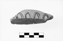 | Description: | Two fragments of a large pyxis with a broad horizontal flange. The outer edge of the flange reserved and set off by a groove, and decorated with an egg pattern made by incising in the unbaked clay. The lower part of the incurving wall above the flange also reserved, this also decorated with a large egg pattern, here drawn carelessly in glaze. Dull black glaze. ADDENDA P 21112 is a non-joining fr. of this pyxis. Several additional fragments, one joining, the others found in tin ΝΝ 399 (cistern at 69/ΜΖ = B 18:13). | |