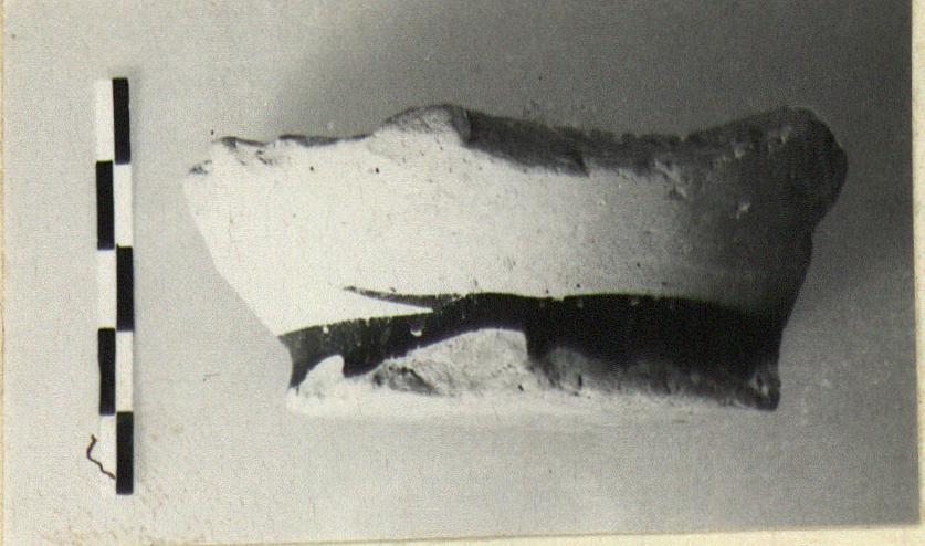 | Description: | From a closed pot; part of flat base with straight side and of widely flaring wall preserved. Pinkish clay, buff at core and on outer surface; a band of dark brown paint around base. Middle Helladic Fragment: Matte Painted. | |
