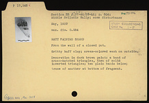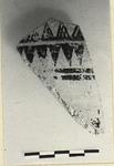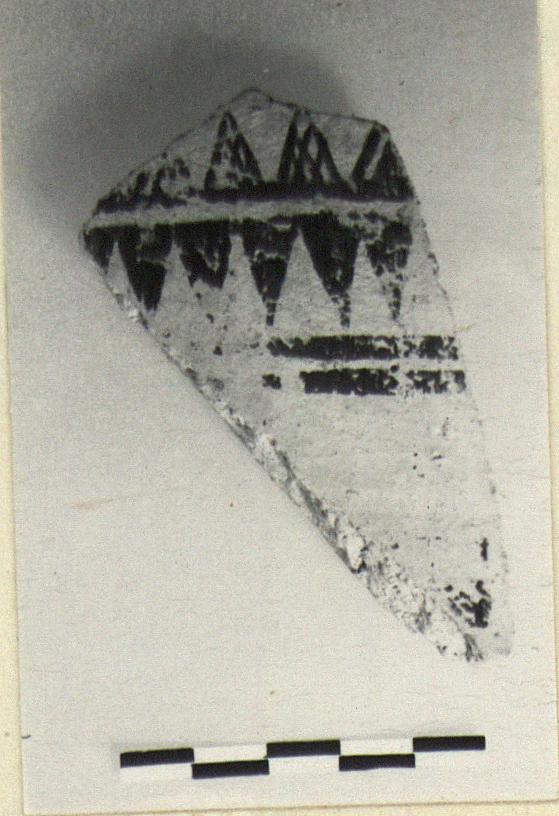 | Description: | From the wall of a closed pot. Decoration in dark brown paint: a band of cross-hatched triangles, then of solid inverted triangles; two plain bands below; trace of another at bottom of fragment. Matte painted. | |
