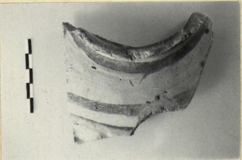 | Description: | Two non-joining fragments: a) part of flaring neck and plain rim; decorated with two uneven bands of brown around lower part of neck; b) part of the base of the neck and wide shoulder, decorated with a brown band at the base of the neck and two others further out. Clay irregular gray to pink at core and on surface inside; matte cream-colored wash on outside. | |
