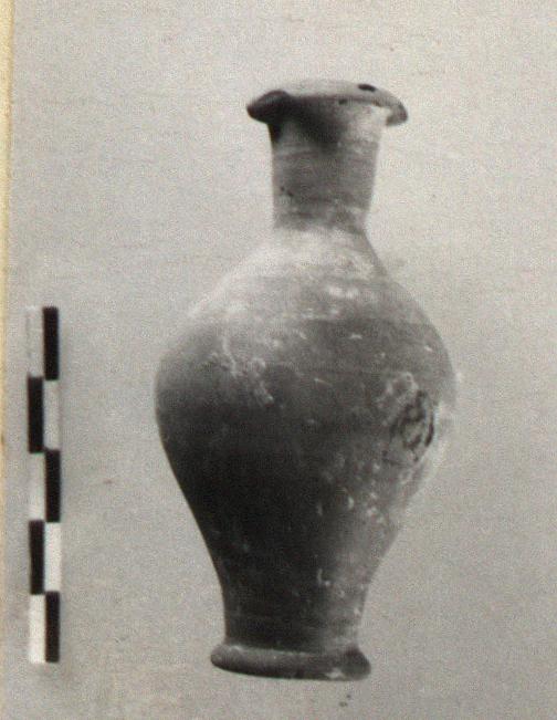 | Description: | Small plump unguentarium; traces of bands around shoulder and base of neck. | |