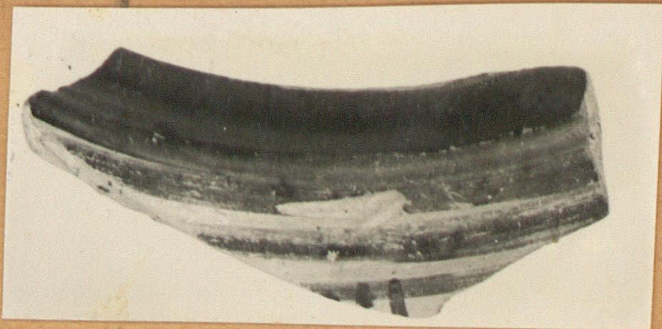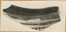 | Description: | Rim fragment; convex side. Inner flange decorated with horizontal and vertical lines. Subgeometric style. | |