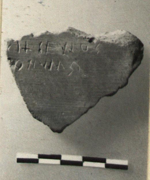 | Description: | From the wall of an amphora; glaze band outside. Incised inside: <graphic> | |
