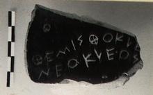 | Description: | Floor fragment of black glazed kylix, with part of stem. Incised on floor: <graphic> | |