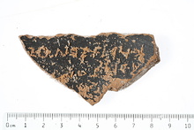 | Description: | From a semi-glazed krater. Incised inside: <graphic> Dull black glaze inside only. | |
