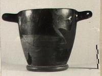 Description:   The base reserved, and part of the wall to the rim, mended from several pieces, with the attachment of one handle. A non-joining piece preserves the other handle. Heavy ring foot; steep walls. Scraped groove around wall above foot outside. Beneath, the resting surface reserved and the space inside the foot with a single thin glaze circle and small central dot.