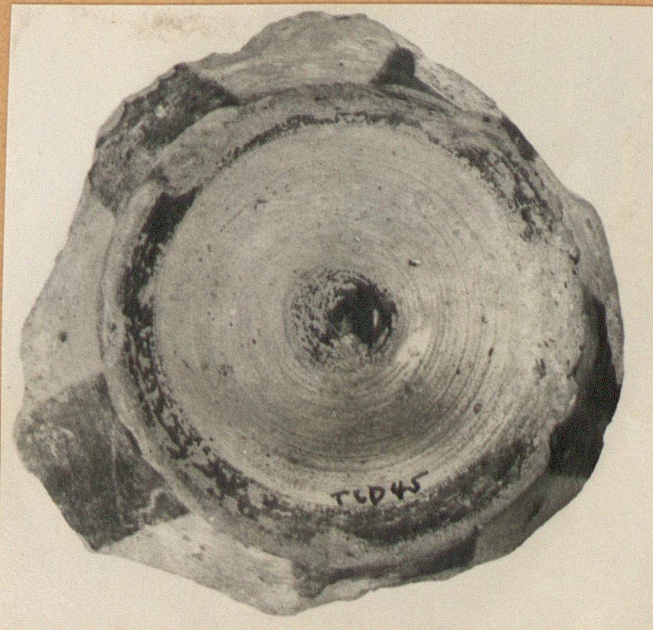 | Description: | Ring base. Rays; band on ring; dot under foot. Glazed inside. Perhaps from the same vase as P 1767(?) (cf. P 579, possibly by the same hand). | |