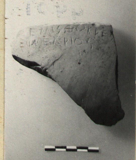 | Description: | From the wall of a plain heavy amphora. Incised outside: <graphic> | |