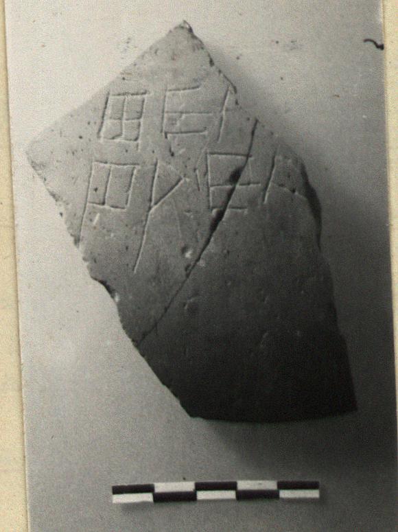 | Description: | Mended from two pieces. From the wall of a plain amphora. Incised outside: <graphic> | |