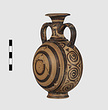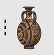 | Description: | Complete save minor chips. Concentric circles on wide faces, running spirals on narrow faces. Rather high, slightly flaring ring foot; band handles; projecting lip decorated on top with two reserved bands. Buff clay; black to brown glaze. | |