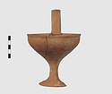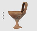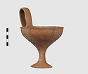 Description:   Complete save minor chips. Tall stem; single high-swung handle. Flaring conical foot; lip slightly out-turned.