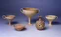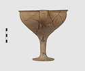 | Description: | Complete save minor chips. Tall stem; two small vertical handles not rising above lip. Small lip out-turned and offset outside. The foot almost a flat disk with a small hollow cone at the center beneath; a groove around its outer vertical face. Pink clay; smooth creamy buff surface on exterior. Unglazed. | |