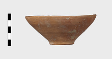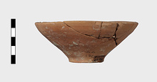 | Description: | Complete save minor chips. A small open bowl with plain rim and small flat foot. Pinkish-buff clay; unglazed. | |