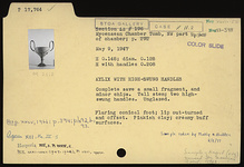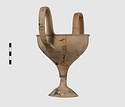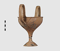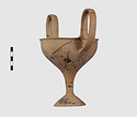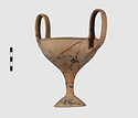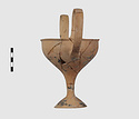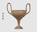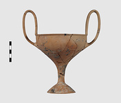 | Description: | Complete save a small fragment and minor chips. Tall stem; two high-swung handles. Flaring conical foot; lip out-turned and offset. Pinkish clay; creamy buff surfaces; unglazed. | |
