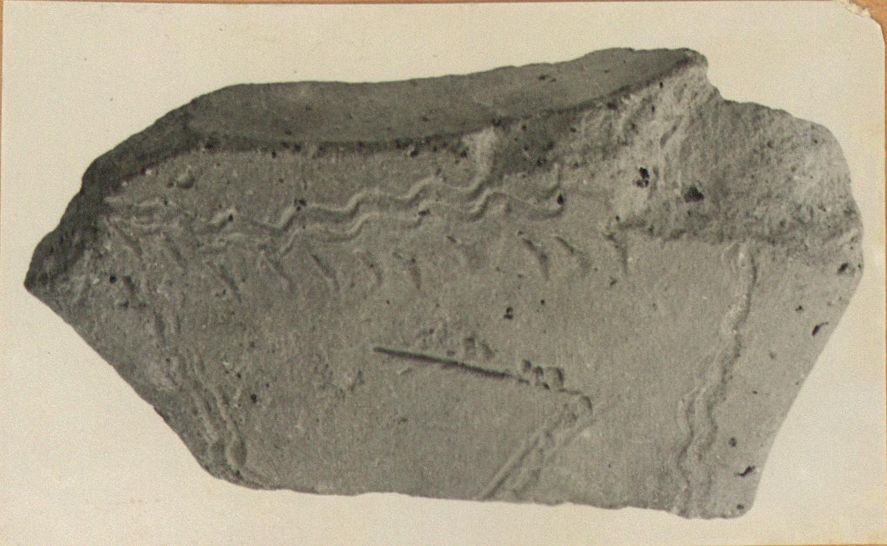 | Description: | Handle fragment of wide-mouthed household jar. Incised double wavy lines and zigzag with subordinate dashes. Household Ware. | |