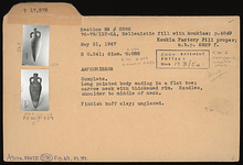 | Description: | Complete. Long pointed body ending in a flat toe; narrow neck with thickened rim. Handles, shoulder to middle of neck. Pinkish-buff clay; unglazed. | |