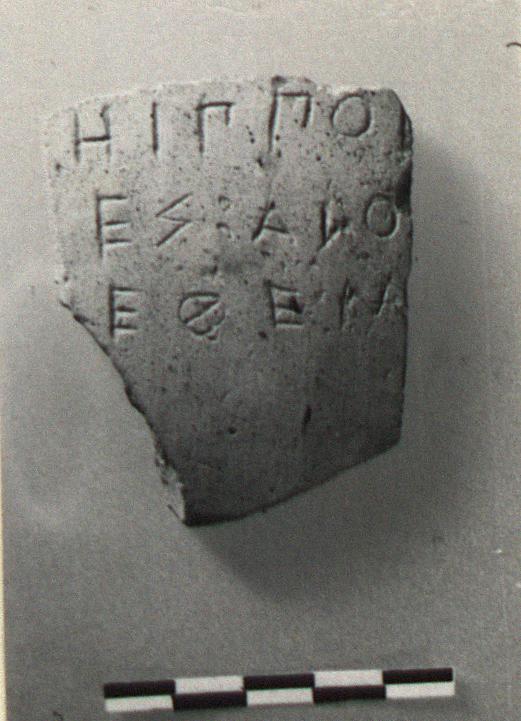 | Description: | From the wall of a coarse amphora. Incised outside: <graphic> Micaceous light buff clay. | |