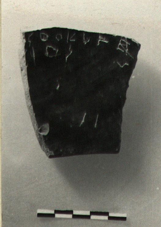 Description:   From the lower wall of a semi-glazed krater; thin black to brown glaze inside.