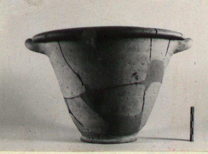 | Description: | Small bits restored in plaster. Ring foot and deep rather pointed body; out-turned rim; rolled horizontal handles set close up against the rim. Pale greenish-buff clay; scanty traces of thin brownish glaze on rim and inside. | |