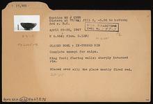 | Description: | Complete except for chips. Ring foot; flaring walls; sharply inturned rim. Glazed over all; the glaze mostly fired red. | |