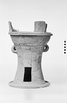| Description: | Small fragments restored. Round bowl on stand. Typical brazier with bearded head lugs. A ring of gouged dots just above the base, and another at the point of attachment of bowl to stand. The horizontal handles, just below the top of the stand, turn up and are attached to the lower wall of the bowl. Stand flat beneath; rectangular air-hole in lower wall; round holes in bottom of bowl. Micaceous red clay. | |