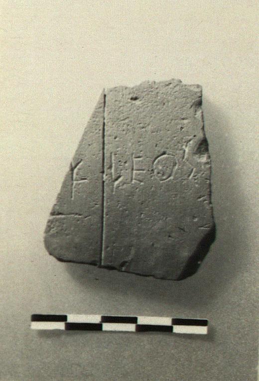 | Description: | Wall fragment from plain amphora. Wheel groove outside. Incised outside: <graphic> Pink clay, grayish towards core; rather thin fabric. | |