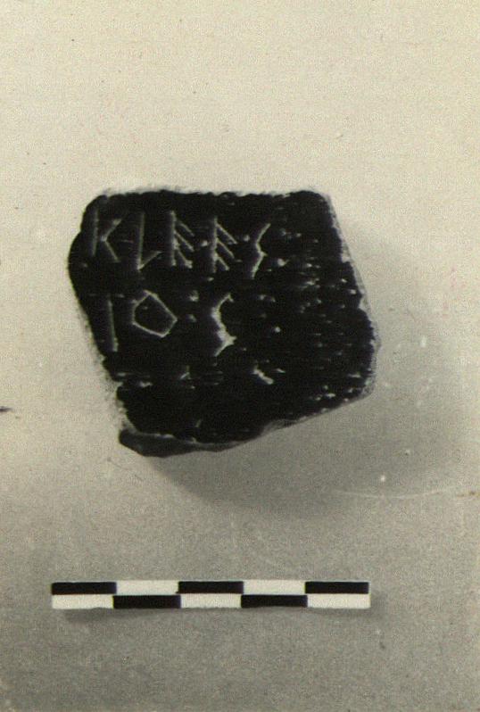 | Description: | Wall fragment from semi-glazed krater. Incised inside: <graphic> Black glaze inside only. | |