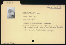 | Description: | Fragment of black glaze lid(?); large knob, broken off. Streaky black glaze on top; unglazed beneath. Incised beneath: <graphic> | |