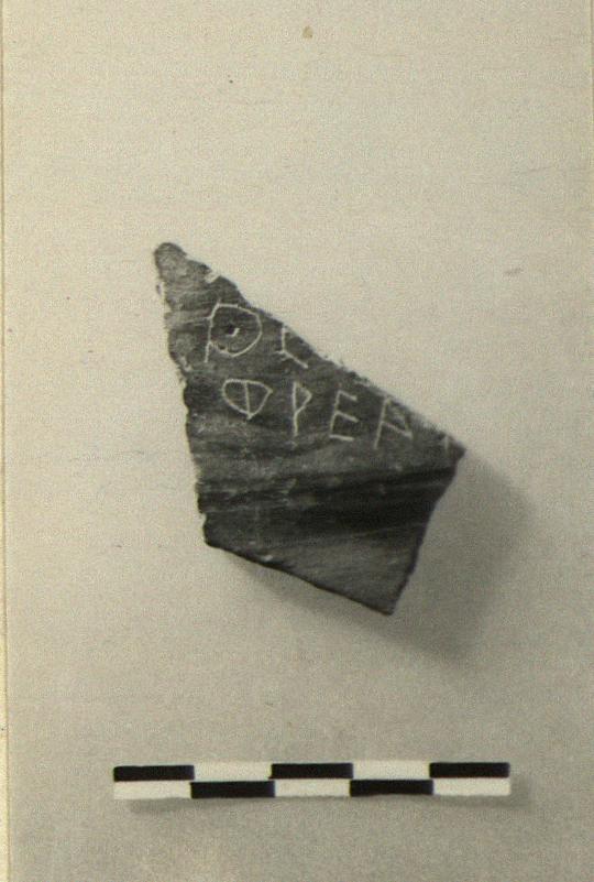 | Description: | Wall fragment from banded amphora(?). Incised outside: <graphic> Brown wash and band outside; unglazed inside. | |