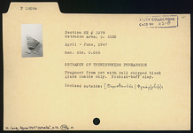 | Description: | Fragment from pot with dull chipped black glaze inside only. Incised outside: <graphic> Pinkish-buff clay. | |