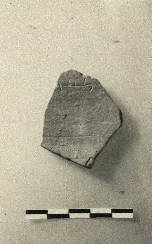 | Description: | Fragment from semi-glazed oinochoe(?). Incised inside: <graphic> Thin fabric, light red with white bits; glaze wash outside. | |