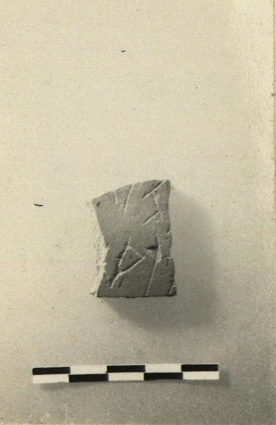 | Description: | Fragment from plain pot. Incised outside: <graphic> Light red clay, orange-buff surface. | |