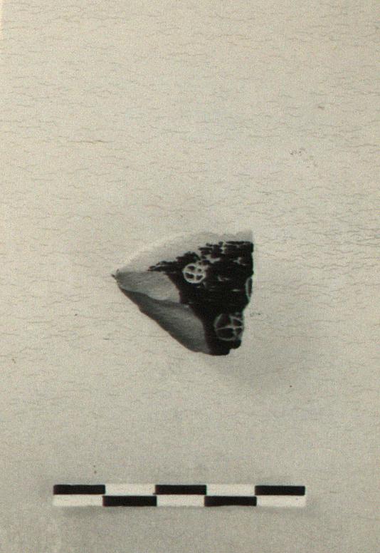 | Description: | With P 18067. Fragment from black glazed kylix base; torus edge reserved. Incised beneath: <graphic> | |