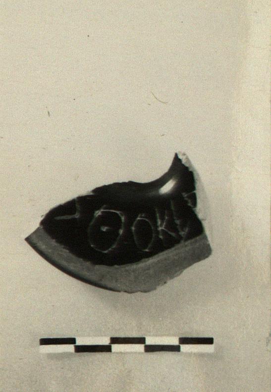 | Description: | Fragment from black glazed kylix foot. Torus edge reserved and grooved around upper edge of vertical face. Incised beneath: <graphic> Very good glaze. | |