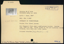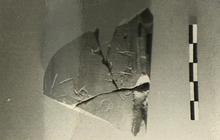 | Description: | Mended from three pieces. Rim fragment from small semi-glazed krater. Narrow rim, flat on top. Incised outside: <graphic> Black glaze on rim and (peeled) inside. Outside, thin wash and brown bands. | |
