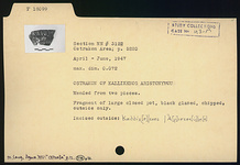 | Description: | Mended from two pieces. Fragment of large closed pot, black glazed, chipped, outside only. Incised outside: <graphic> | |
